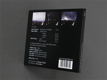 A Change of Light – Bryars, Lang, Hillier. Just four of the pieces, by Gavin Bryars, Steve Hillier and David Lang. Recorded by Asa Bennett, and mixed by Asa, Steve Hillier and Damian LeGassick. It's available from CD Baby and i Tunes and this web site. Also included is a live recording of Andrew performing David Lang's Wed for solo piano.